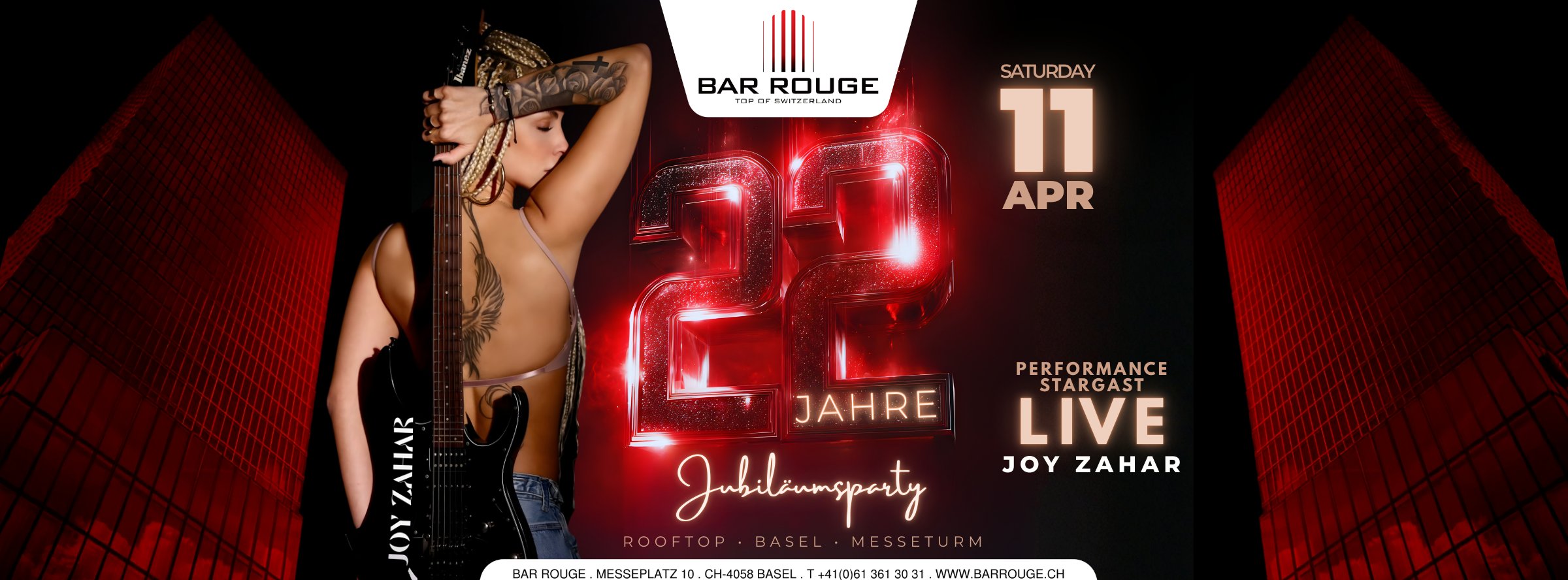 Feiert mit uns ein spektakuläres Jubiläum – 22 Jahre Bar Rouge! Am Samstag, 11. April 2026, entzündet DJane, Gitarristin und Drum Queen Joy Zahar mit einer einzigartigen Show, die Sound, Stil und Feuer verbindet, die Nacht.