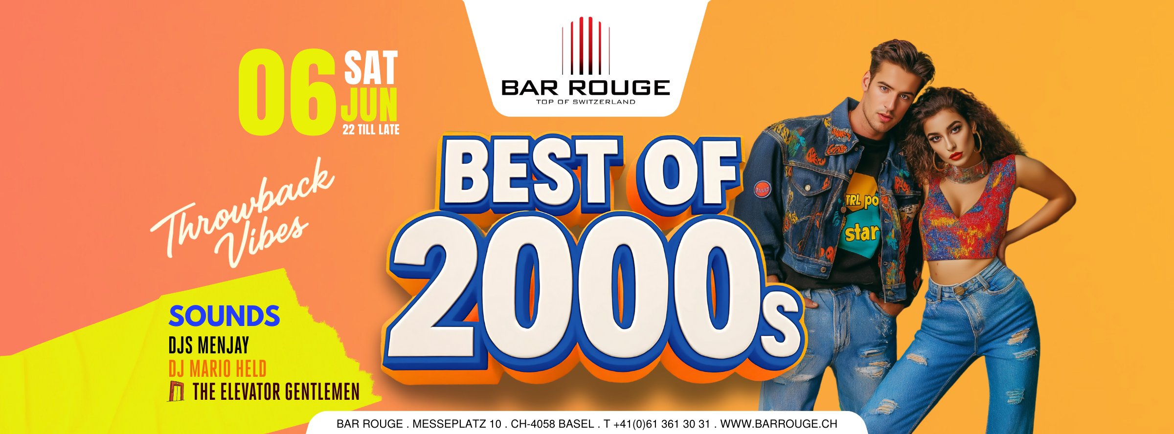 Geniesse auf 105 Metern Höhe trendige Cocktails von stylishen Bartendern und bestaune den atemberaubenden Blick auf Basel. Tanze auf zwei Floors zu Club Classics, RnB, Latin und angesagten Charts im 31. Stock oder tauche im 30. Stock ein in die Ära von Hits wie Britney Spears' "Toxic", OutKast's "Hey Ya!", Rihanna's "Umbrella" und Lady Gaga's "Poker Face". Komm zur Best of 2000 Party, bring deine Freunde mit, zeig uns deine angesagtesten Dance Moves und geniesse eine unvergessliche Nacht. Join the club!