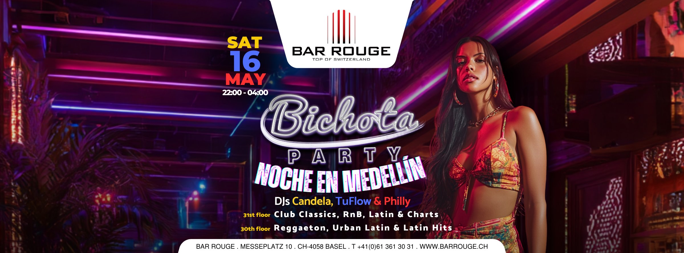 Schwingt auf dem Bichota Floor eure Hüften zu Reggaeton, Urban Latin und weiteren Latin Hits. Hier sind die Männer die Beute. Schnappt euch eure besten Freundinnen, feiert bis zum Morgengrauen und geniesst die spektakuläre Sicht über Basel. Unsere exotischen Cocktails versetzen euch ins ewige Sommerfeeling.