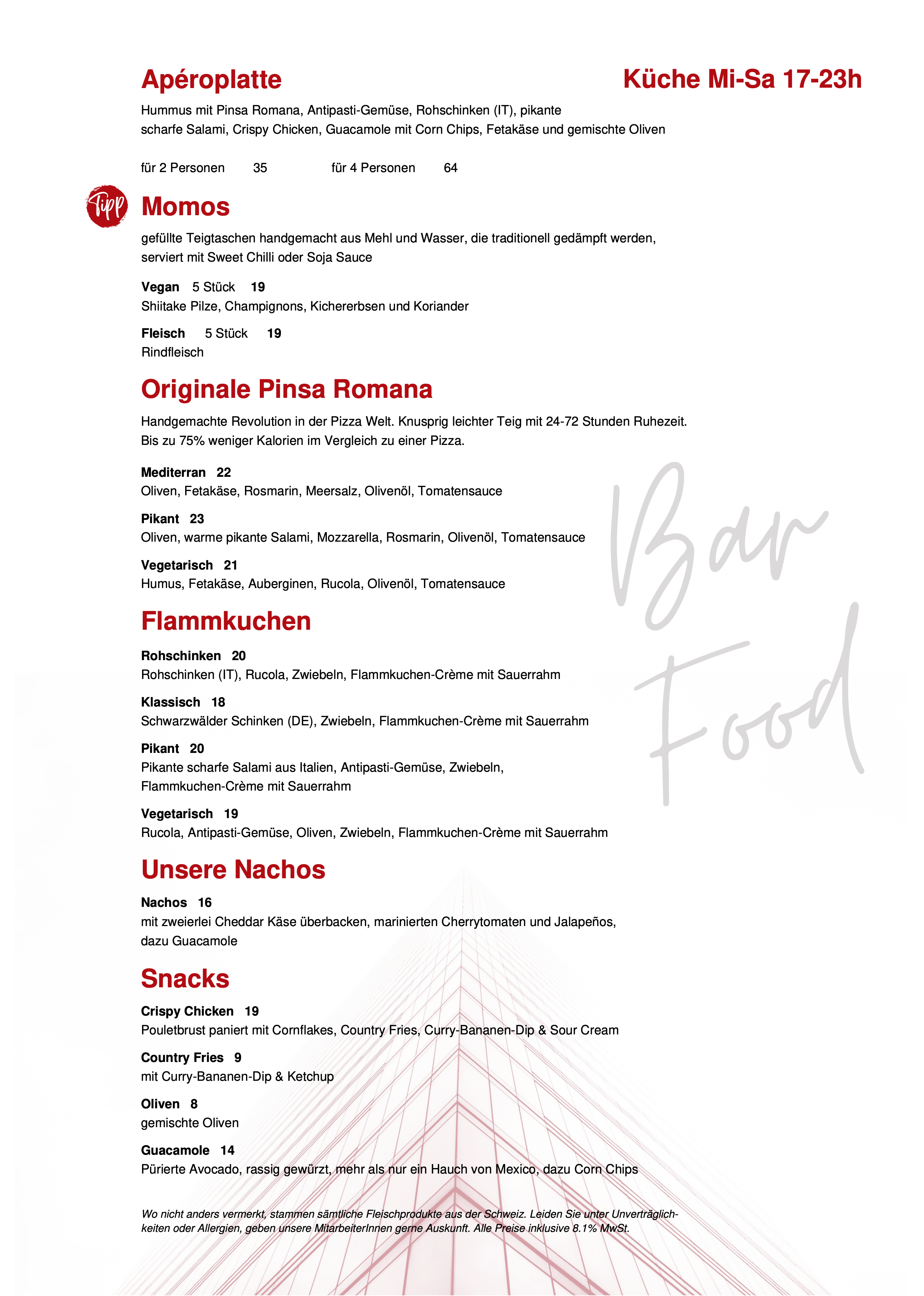 Wenn Sie einen besonderen Ort für Ihren Apéro oder eine kreative Barfood-Karte suchen, sind Sie in der Bar Rouge in Basel genau richtig. Wir freuen uns, Sie mit unseren Köstlichkeiten verwöhnen zu dürfen.