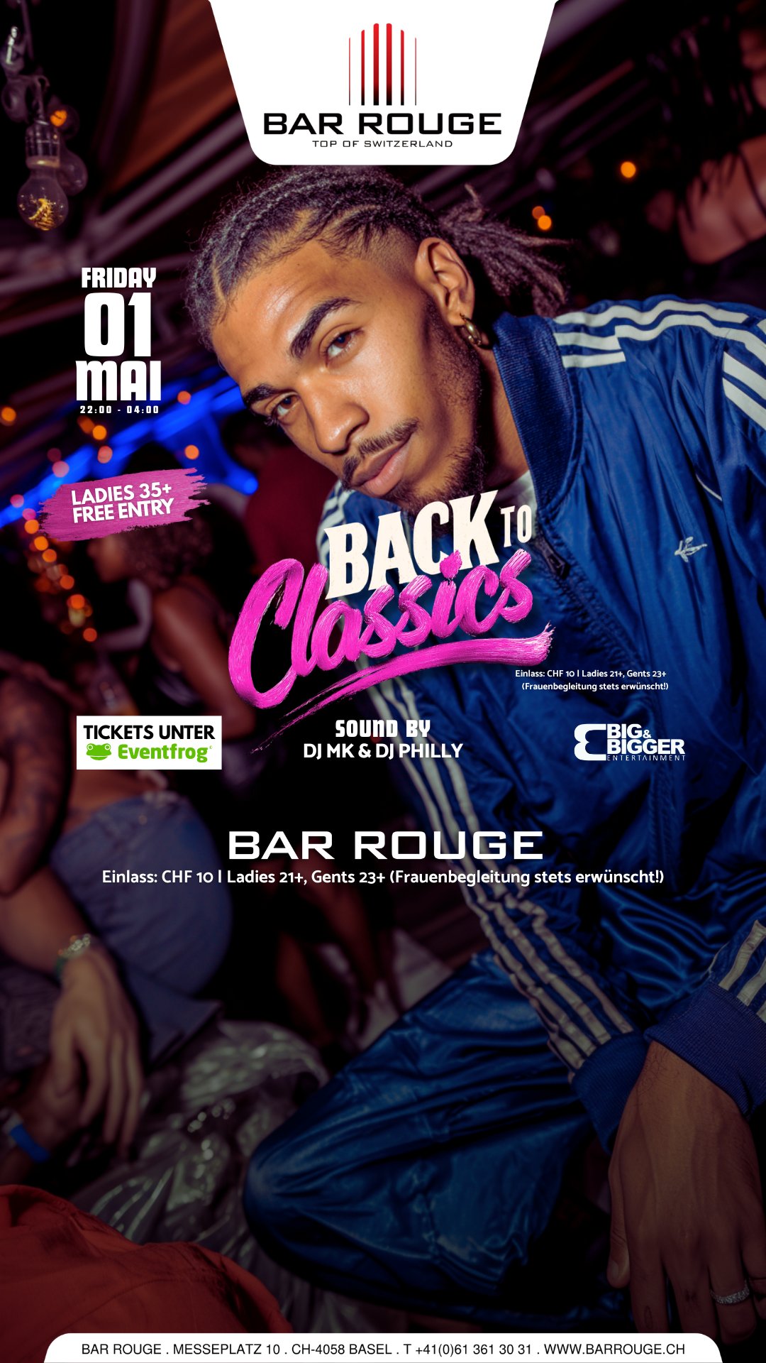 Erlebe eine unvergessliche Partynacht hoch über Basel – bei Back to Classics in der Bar Rouge. Feiere im spektakulären Ambiente des 30. Stocks mit Blick über die Stadt.