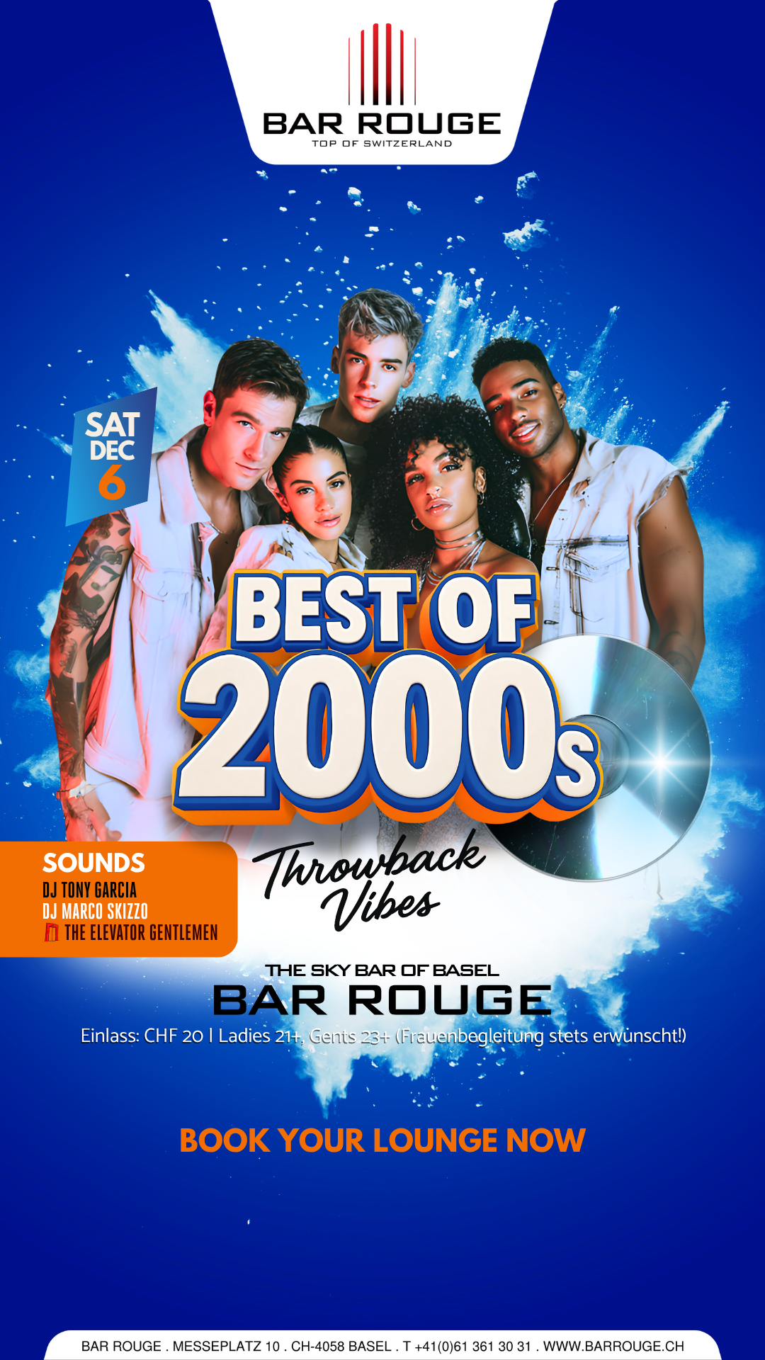 Geniesse auf 105 Metern Höhe trendige Cocktails von stylishen Bartendern und bestaune den atemberaubenden Blick auf Basel. Tanze auf zwei Floors zu Club Classics, RnB, Latin und angesagten Charts im 31. Stock oder tauche im 30. Stock ein in die Ära von Hits wie Britney Spears' "Toxic", OutKast's "Hey Ya!", Rihanna's "Umbrella" und Lady Gaga's "Poker Face". Komm zur Best of 2000 Party, bring deine Freunde mit, zeig uns deine angesagtesten Dance Moves und geniesse eine unvergessliche Nacht. Join the club!